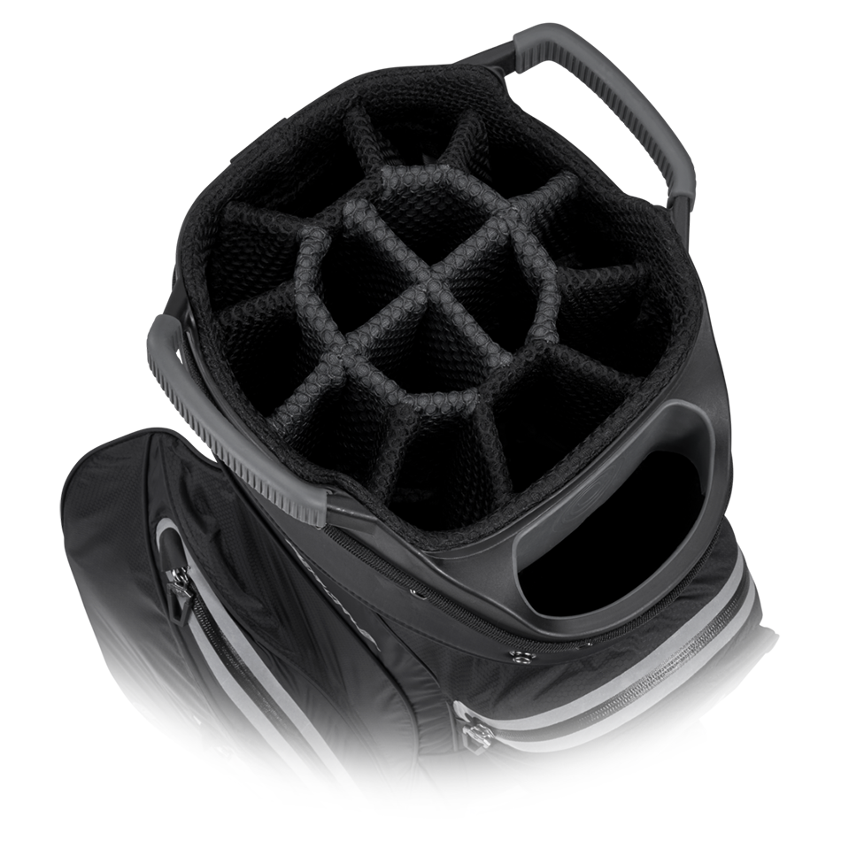 The Hyper Dry Cart Bag from Callaway is designed to fill all requirements for golfers, while offering 100% waterproof protection. Featuring a new 15 way friendly divider system with 15 individual length dividers and an integrated TPE putter section. The Hyper Dry 15 Cart bag also has an ‘E’ trolley friendly base which allows the bag to fit perfectly on either push/pull or electric trolleys. The bag features 9 waterproof pockets which include and range of valuables pockets, cooler pocket, full length pockets & more.