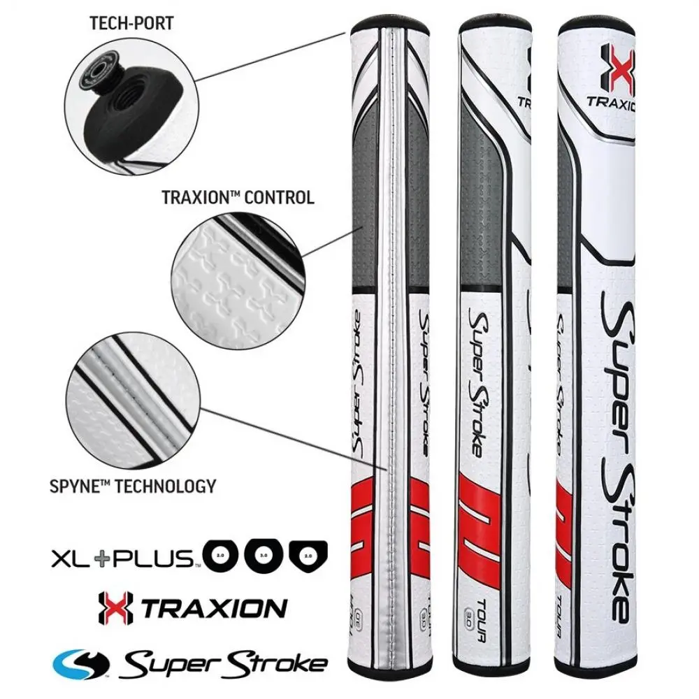 SUPERSTROKE Traxion tour Grip in 3.0 (midsize) and 2.0 (slimmer). Including counter core weight. The original and the best β The SuperStroke Traxion tour is a more mid and thinner version that weighs in with a medium weight and designed to provide more feel for longer putts in the hands less livelier through the putting stroke. Strategically designed TRAXION zones on the tacky polyurethane outer layer offers an amazing comfortable feel leading to greater putting confidence #1 Jumbo Grip On Tour β The SuperStroke were the #1 most played jumbo putter grip model on the PGA Tour.