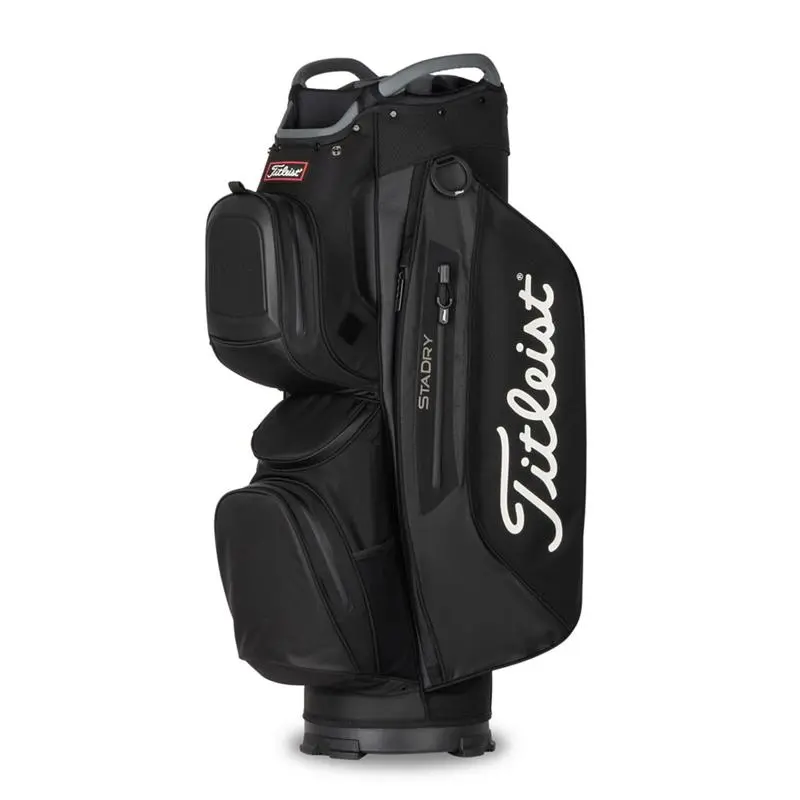 The new Titleist 15 StaDry Cart Bag – A premium waterproof and functional cart bag. Features include a single strap, 15 way top with integrated handles, full length dividers, dedicated putter well and a rain hood. This 9 pocket design is constructed with StaDry technology, has seam sealed zippers, two velour lined valuables pockets.